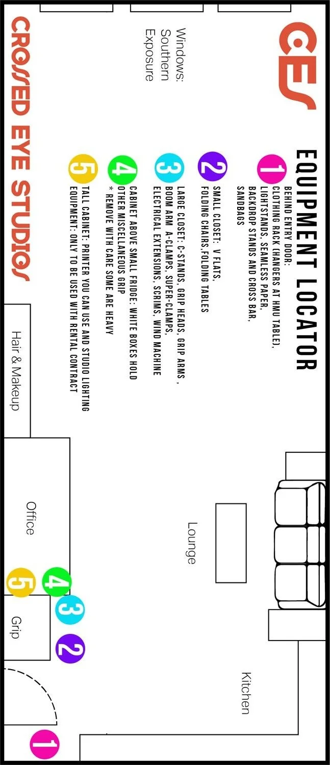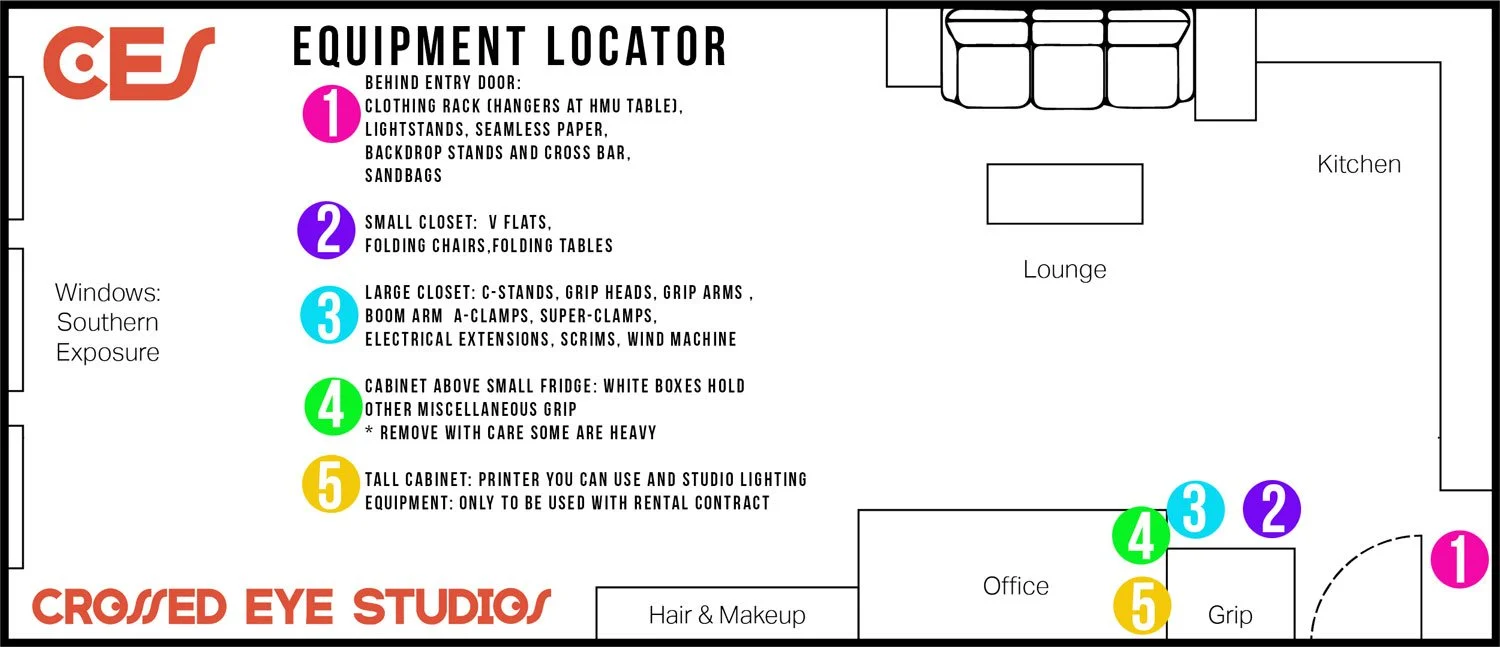 STUDIO EQUIPMENT: Standard Grip equipment available for your use and details of location below.